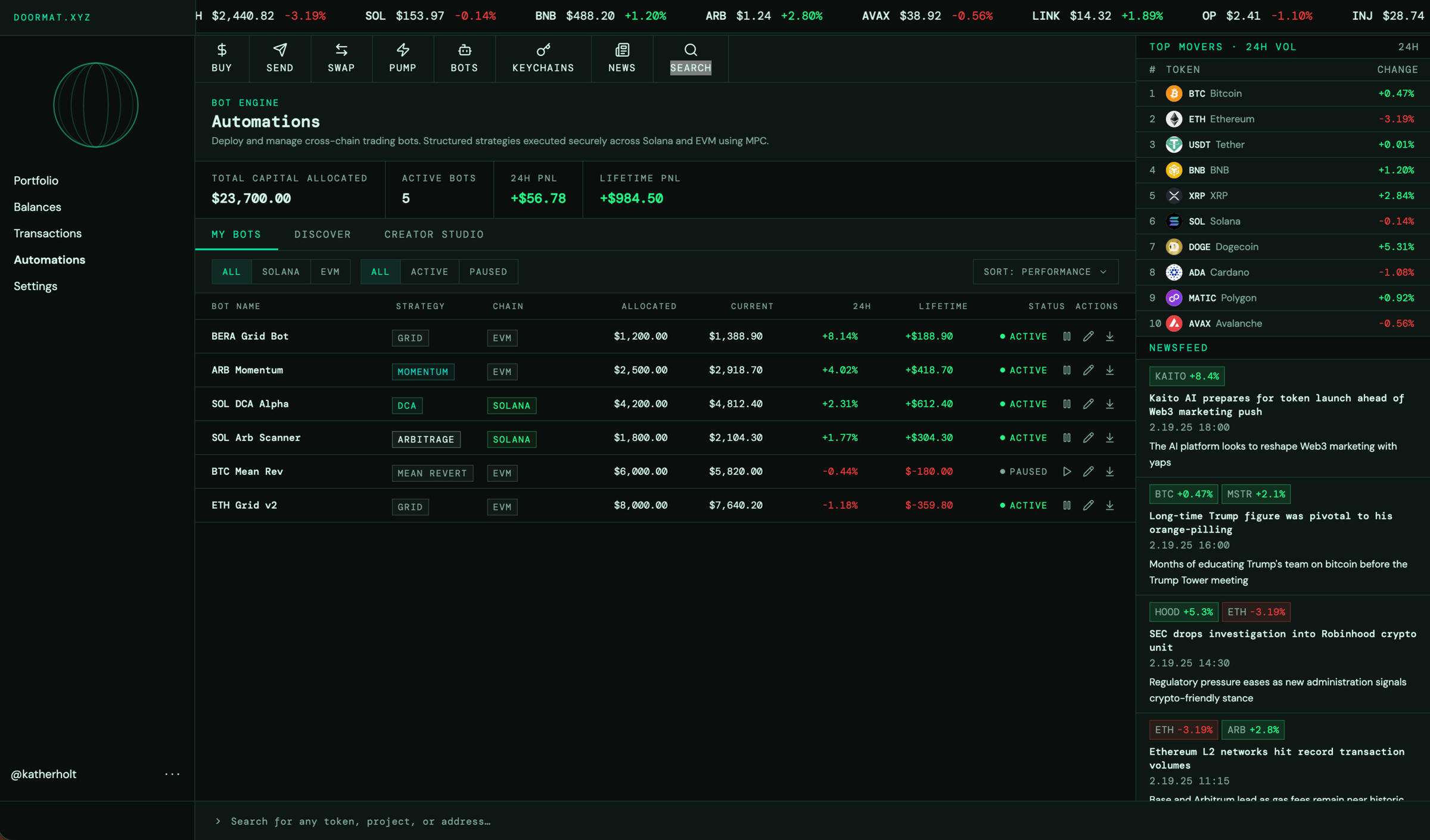 Doormat was an MPC-powered trading terminal across Solana and EVM. In late 2024, automation lived primarily inside Telegram bots that required users to give up custody.We explored how to bring automation inside a self-custodial wallet without sacrificing control, clarity, or distribution.