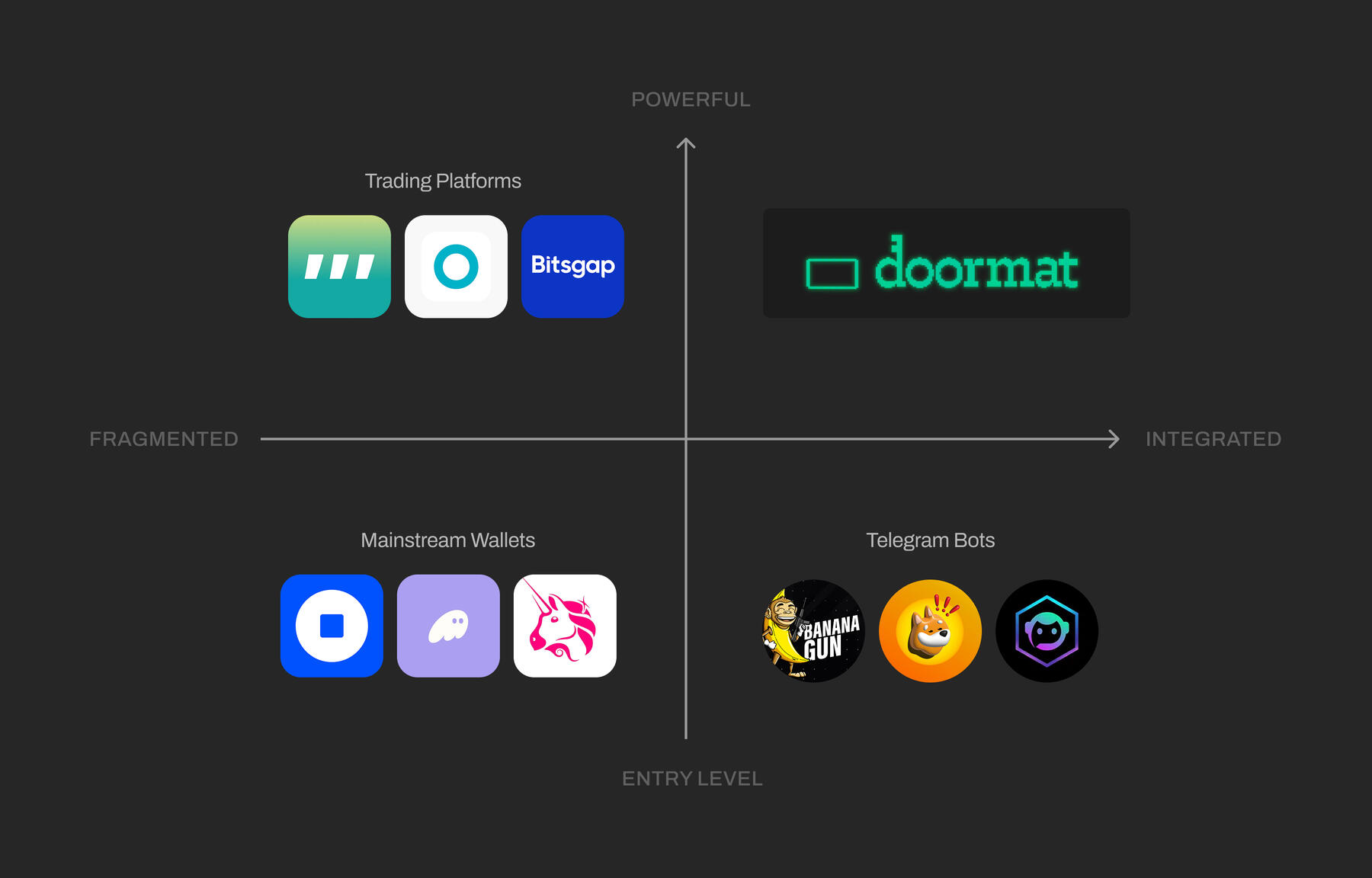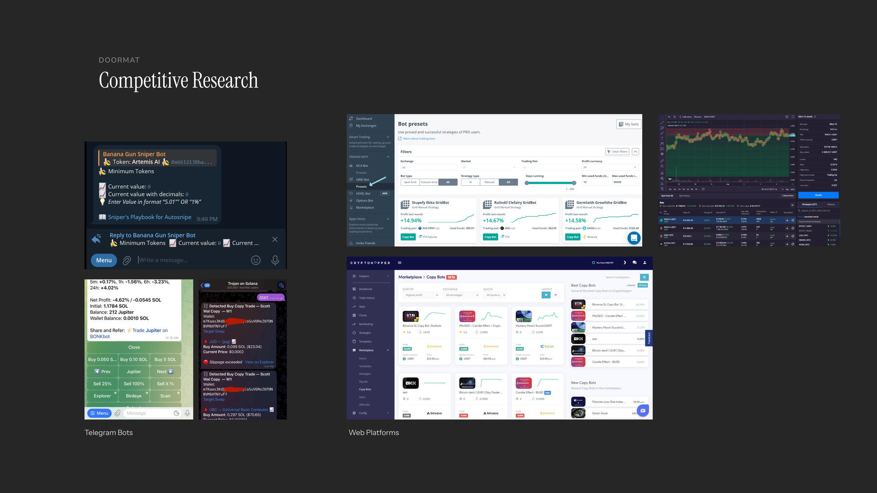 Automation already existed but it was either: Powerful and centralized (web-based trading dashboards) or consumer and opaque (Telegram bots).Telegram bots optimized for speed and virality but required users to give up custody and trust black-box systems. Web dashboards offered more flexibility but assumed exchange accounts and fragmented capital across wallets.Doormat’s differentiator was self-custody and consumer-style product with powerful trading features already integrated.