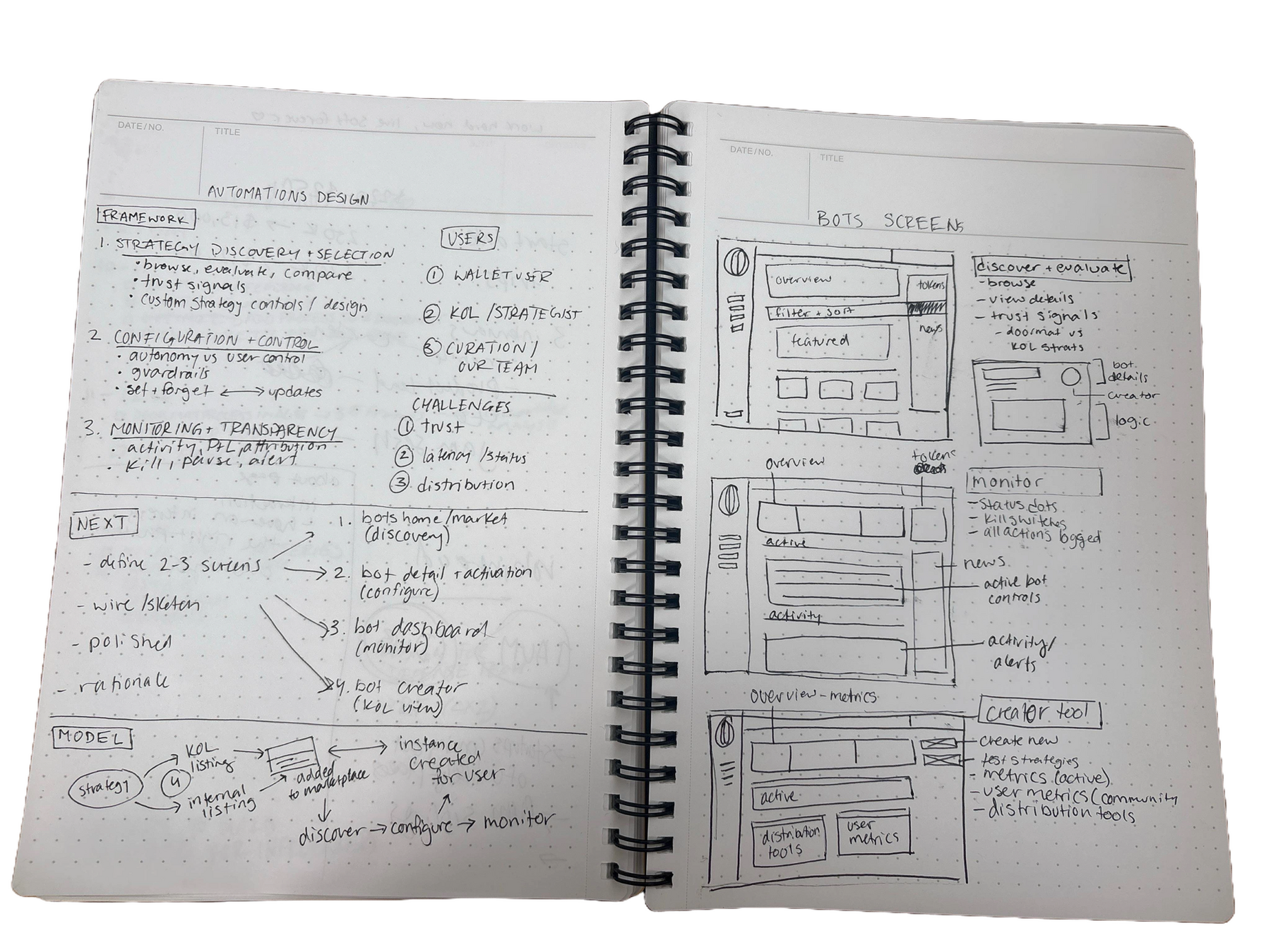 We worked closely with 25 beta power users to validate demand for automations and recruited 5 KOLs as design partners. These were traders actively sharing strategies with communities on Twitter and Telegram.In parallel, we analyzed Banana Gun, Trojan, and web-based automation platforms. Users were already running recurring strategies and sharing them publicly. What they lacked was a secure, legible system to discover, deploy, and manage them.This shifted our focus from building “better bots” to designing a marketplace with trust and distribution built in.